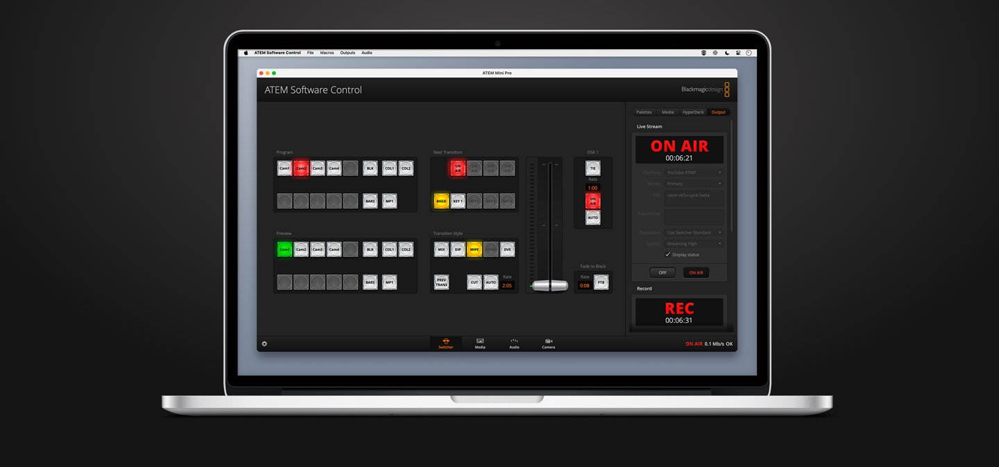 Mezclador económico para producciones en directo que incluye 4 entradas HDMI con conversión de formatos, salida USB que permite detectarlo como una cámara web, herramientas de audio con ecualizador y procesadores de dinámica, efectos visuales digitales, transiciones, composiciones por crominancia con fondos verdes y 20 imágenes para títulos, entre otras prestaciones. El modelo ATEM Mini Pro permite grabar archivos H.264 en unidades USB, transmitir directamente a través de plataformas tales como YouTube Live, Facebook y Twitch, y supervisar las señales de varias cámaras en un solo monitor. Por su parte, la versión ATEM Mini Pro ISO brinda la posibilidad de grabar hasta cinco señales limpias en archivos de DaVinci Resolve para su posterior edición, a fin de realizar el montaje con mayor rapidez, o en formato Blackmagic RAW con el propósito de finalizar el proyecto en definición UHD.
