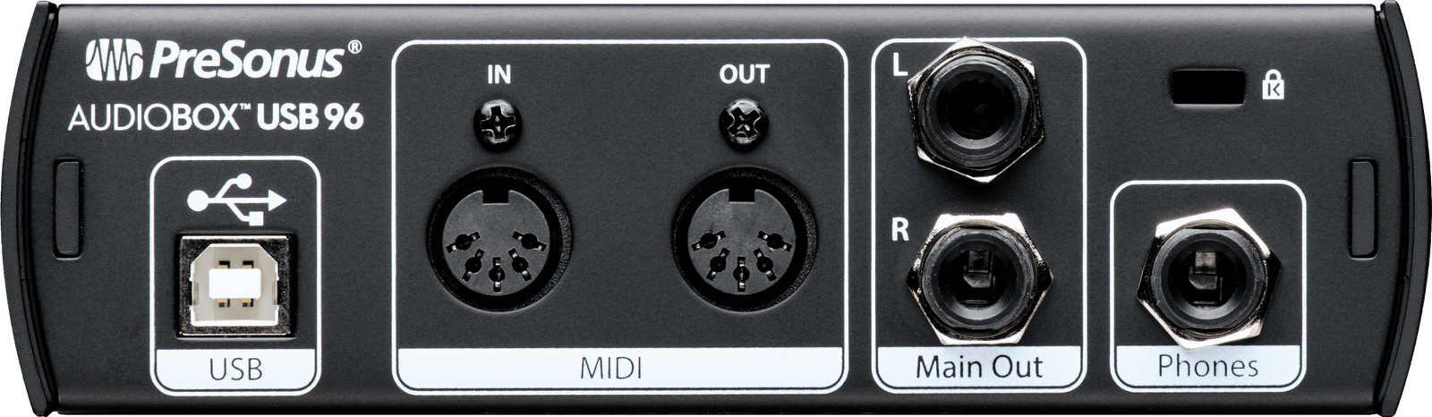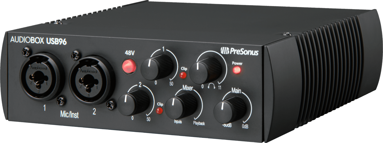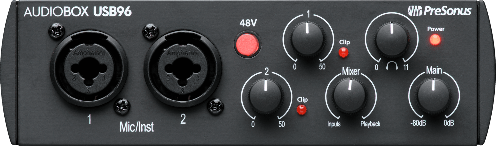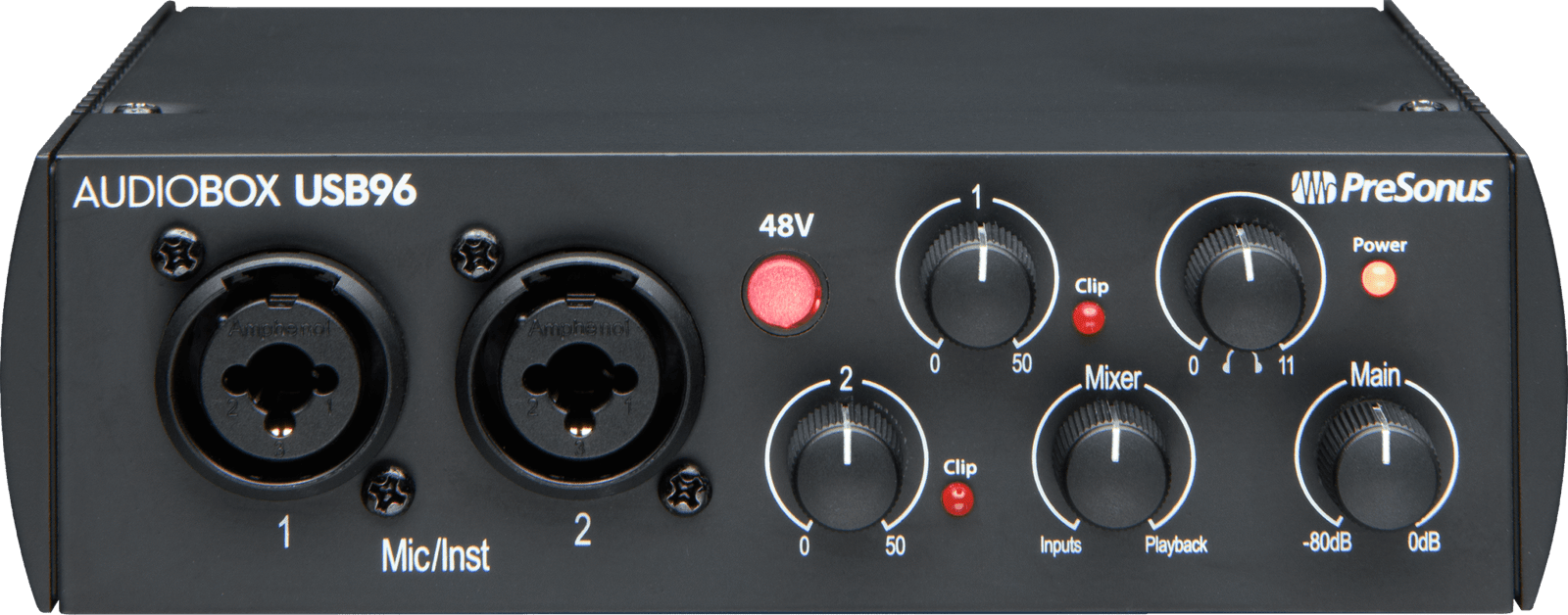 Dos entradas combinadas de micrófono/instrumento en el panel frontal, dos salidas de línea balanceadas, una salida de auriculares ultra potente y E/S MIDI hacen del AudioBox USB 96 una solución de grabación estéreo asequible para cantautores, podcasters, colaboraciones de guitarra o guitarra-bajo y más. Un control de mezcla te permite equilibrar el nivel entre la señal de entrada y la reproducción del ordenador sin latencia.